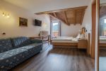Spacious and bright, perfectly suited for couples or small families. Created in memory of grandfather Pire, these rooms embrace you with their authentic warmth and breathtaking views of La Varella, Conturines, and Lagazuoi. Thanks to their south-facing exposure, the rooms are sun-kissed for much of the day.